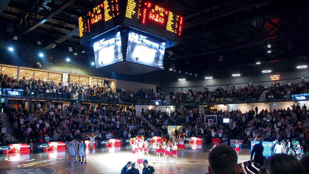Le Palais des Sports de Caen est équipé par Bodet d’un double cube suspendu, un textuel pour les informations sur le match et un autre composé d’écrans LED. © Bodet