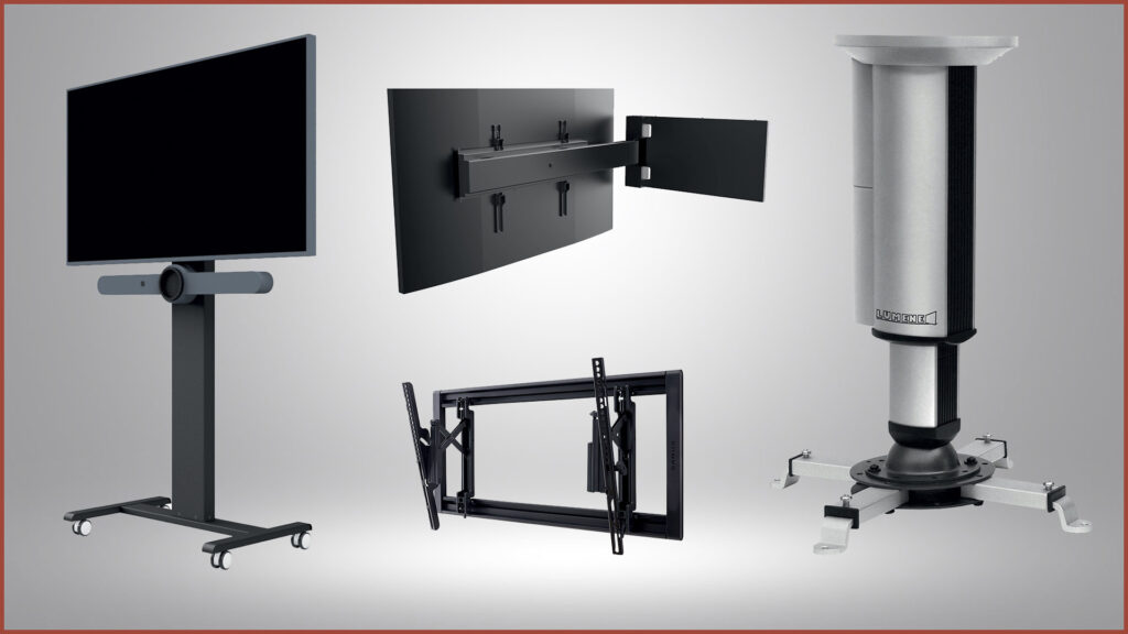 A g : Le chariot sur roulettes est de plus en plus discret et pratique. Ce modèle FSW-VC1 d’Audipack dispose d’un emplacement pour barre de son de visioconférence. © Audipack - A d.:. Le support de plafond universel Lumene pour vidéoprojecteurs accepte tous les modèles jusqu’à 25 kg, avec réglage d’angle et bras télescopique. © Lumene - En bas : Le support Sanus VLT7 orientable (de -7 à +12°) pour écran plat accepte les modèles géants jusqu’à 90” et un poids maximum de 68 kg. © Sanus. En haut : Le support mural Peerless HPF665 accueille les écrans jusqu’à 75” qu’il peut orienter de 30° grâce à son mouvement de pivot. © Peerless