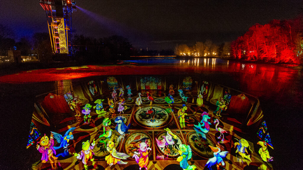 Les entreprises de Groupe Novelty ont apporté leur savoir-faire technique pour réaliser 14 animations composant le parcours nocturne du Parc des Oiseaux, avec en point d’orgue une projection de 17 000 m² sur un lac asséché. © Jean-Jacques Pauget